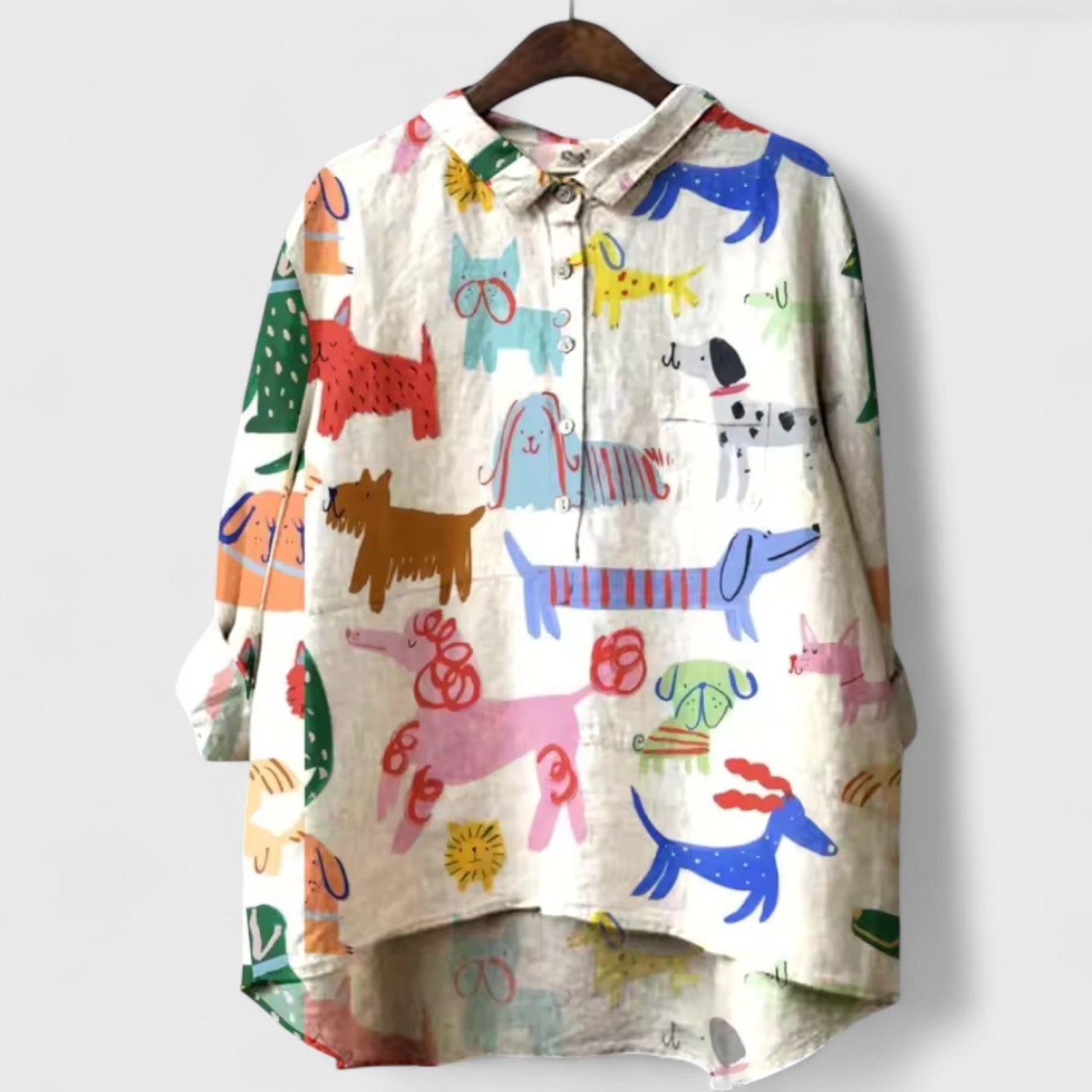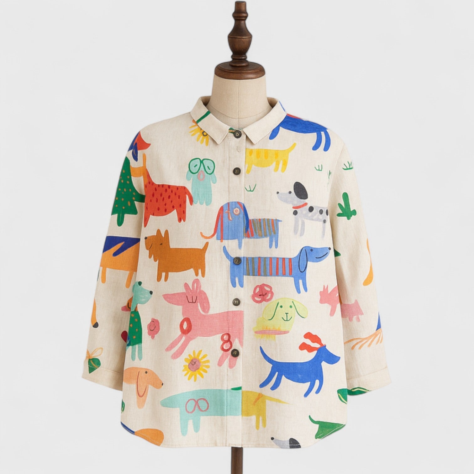 Elva™ stilfull vardagsskjorta עם תבנית משולבת ו-passform avslappnad med ett charmigt och colorglatt hundmotiv. Det lätta och andningsbara material gör den perfekt for både עבודה och fritid, medan den lekfulla designen ger din outfit en personlig touch.